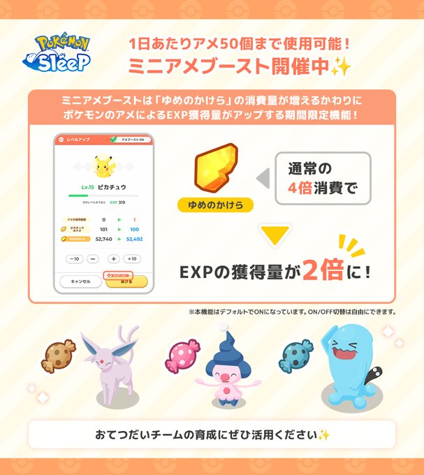 Lv10⇒Lv50まで全部アメブするとアメは300個浮きますが、ゆめのかけらは120,000以上多く使うのでLv50までミニアメブーストで上げるのは個人的に厳しいなと思います。